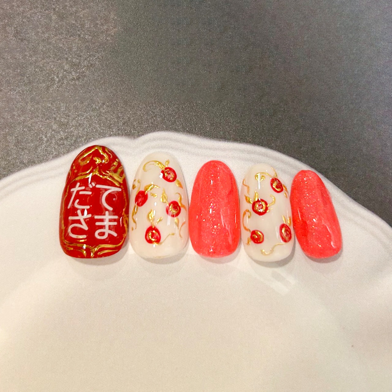 親指に細かいデザイン+他の指1本に簡単なアート+その他の3本はワンカラーのチップです。